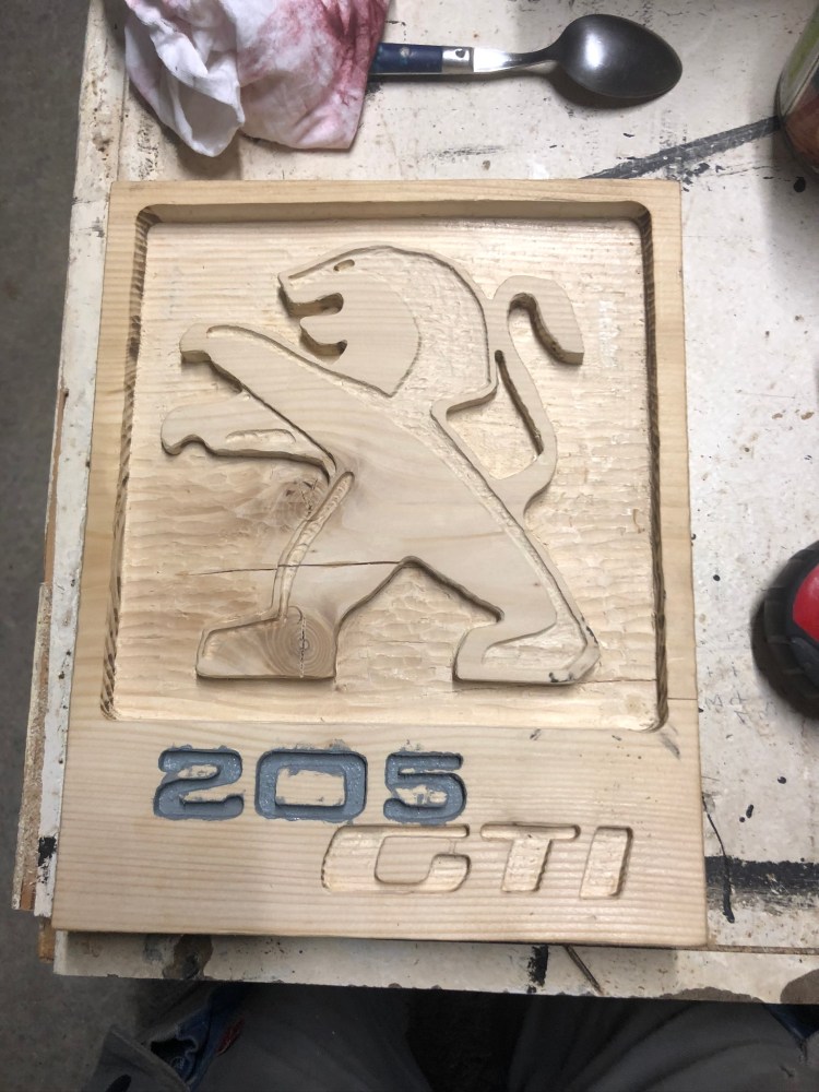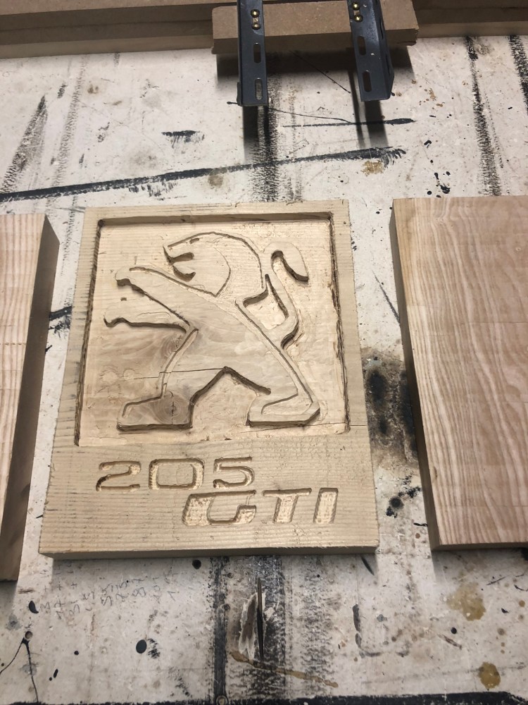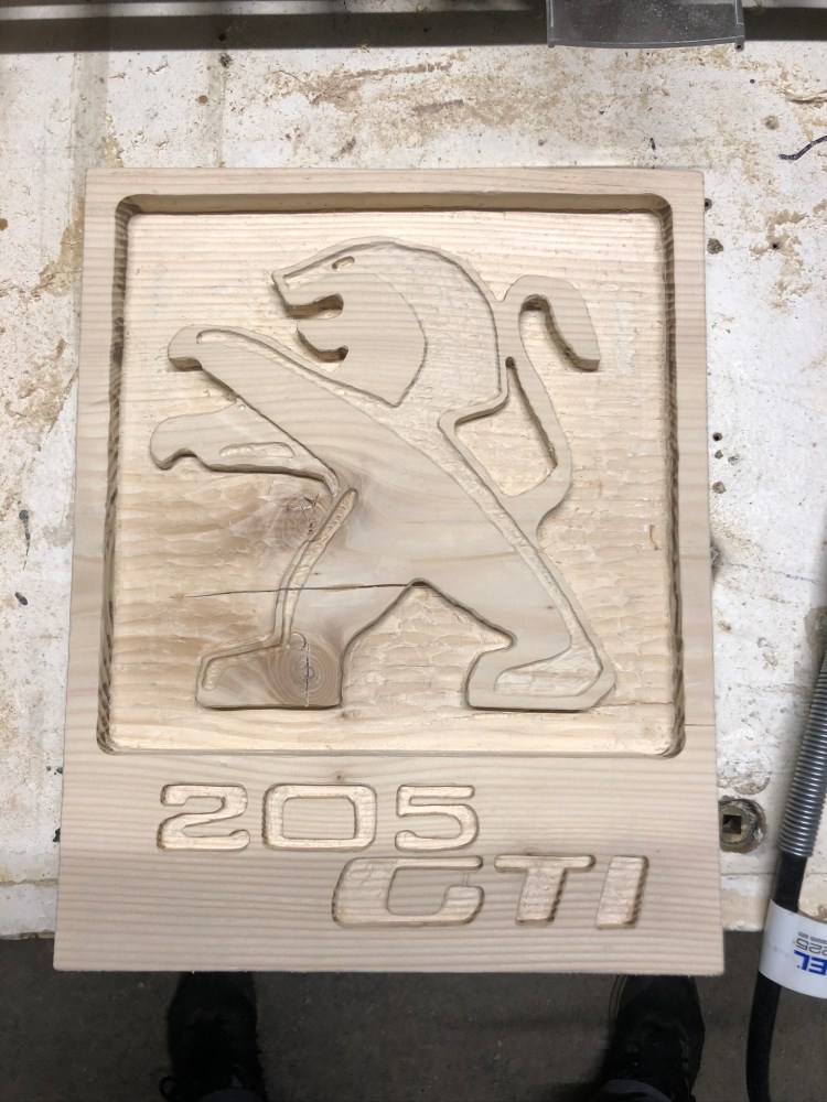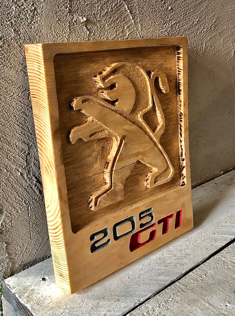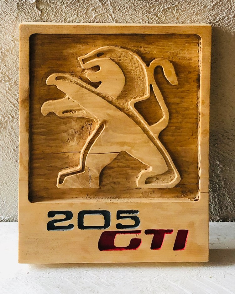 Logo Peugeot 205 GTI gravé en relief sur une planche de pin massif