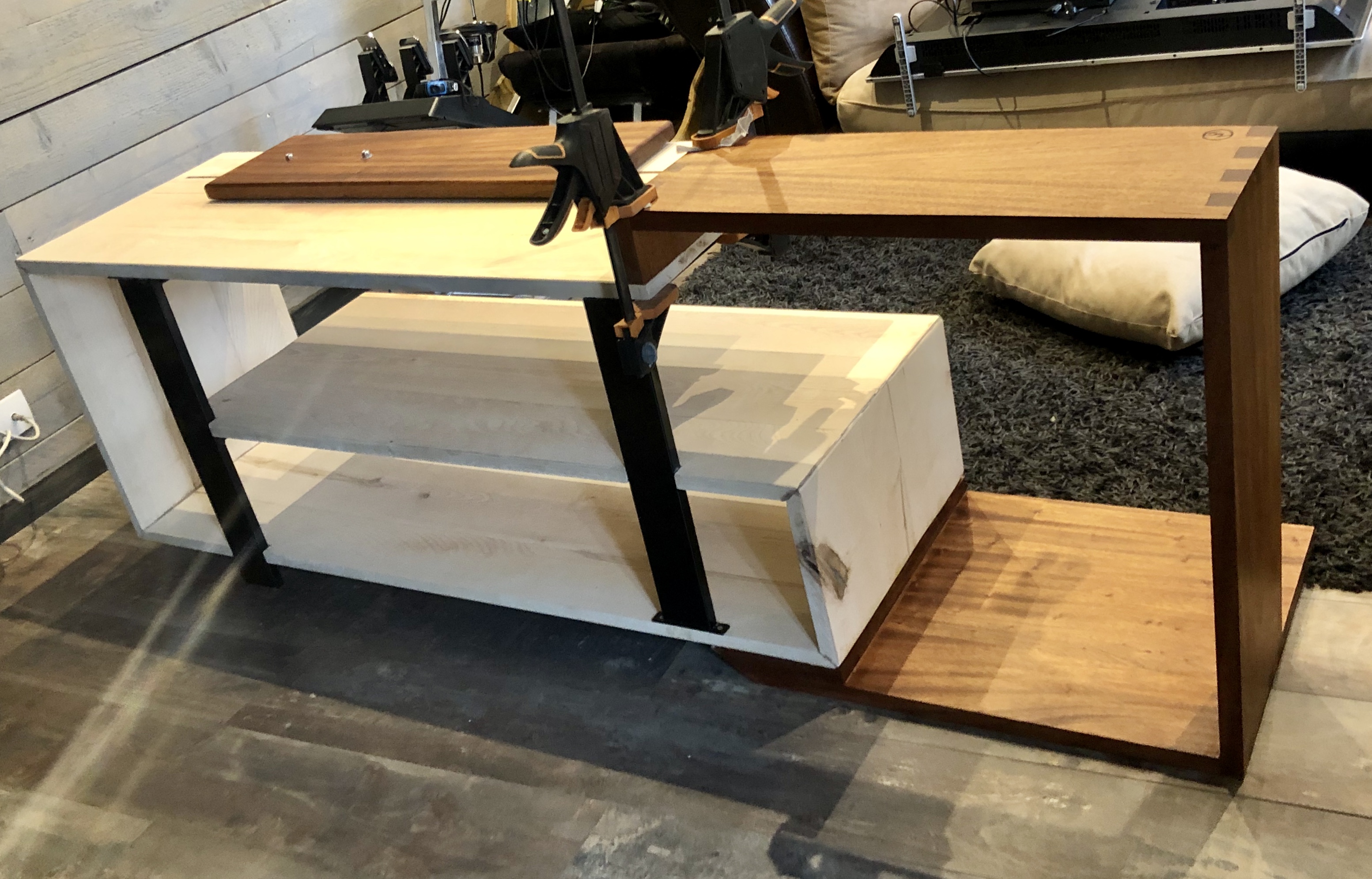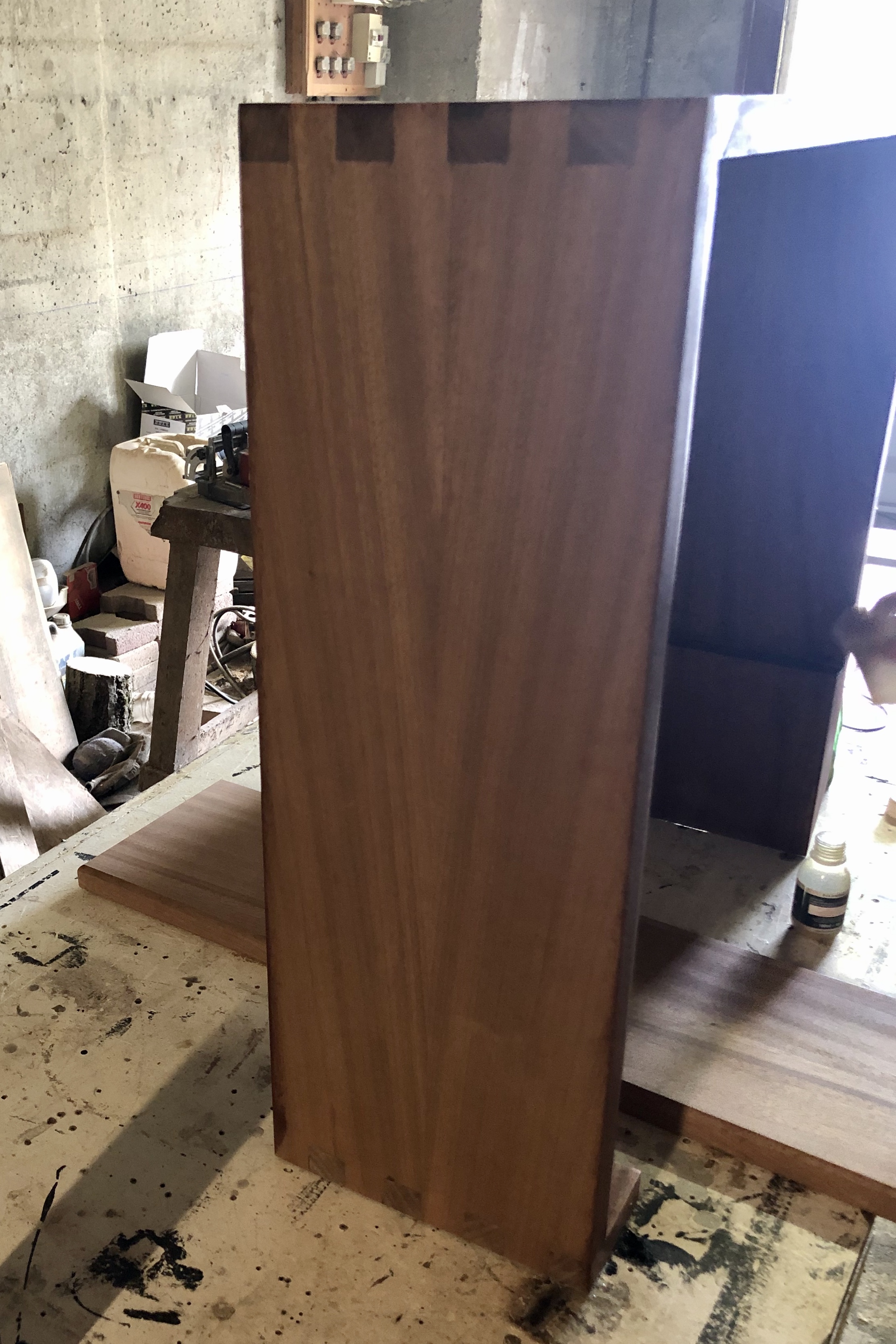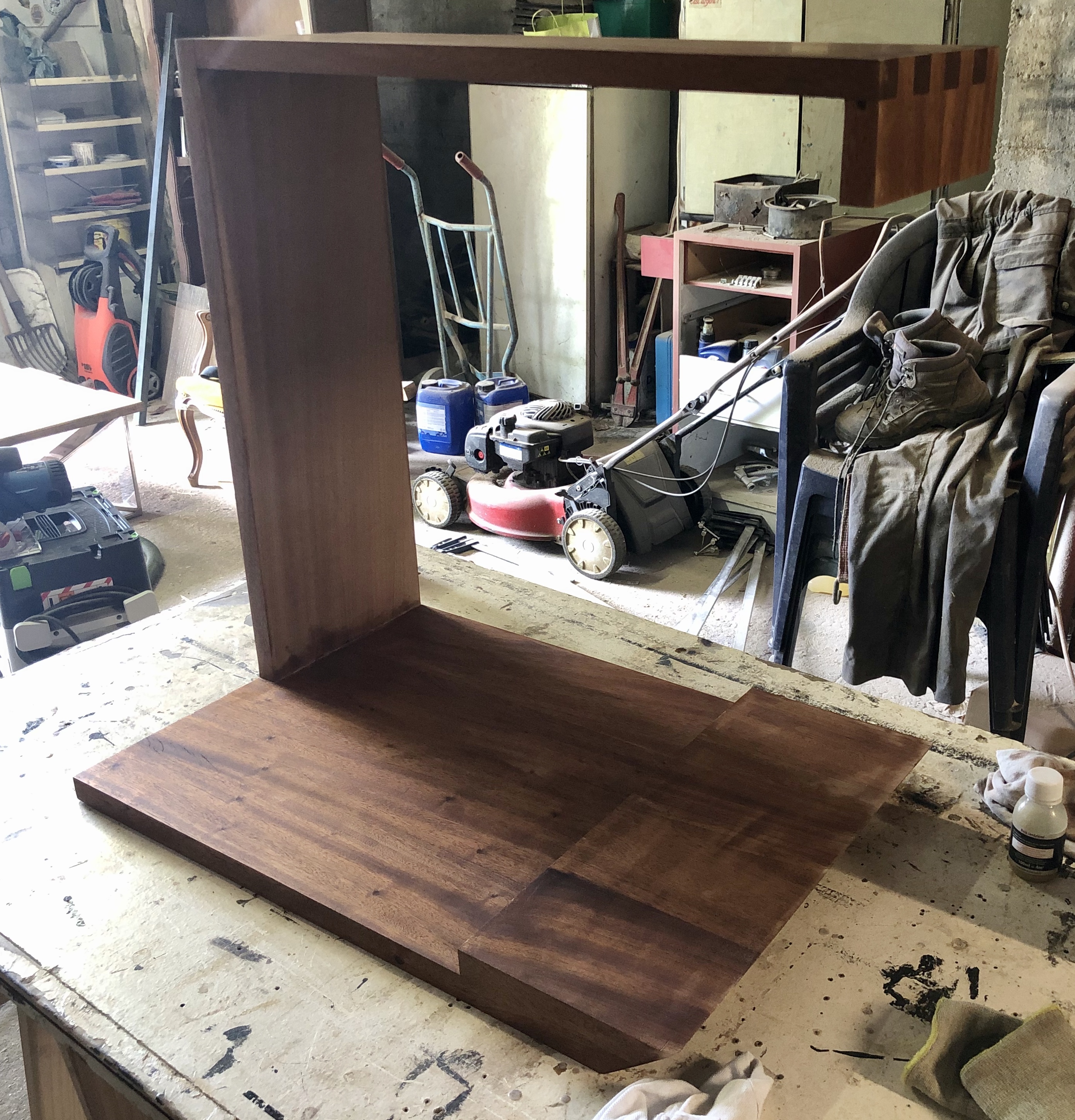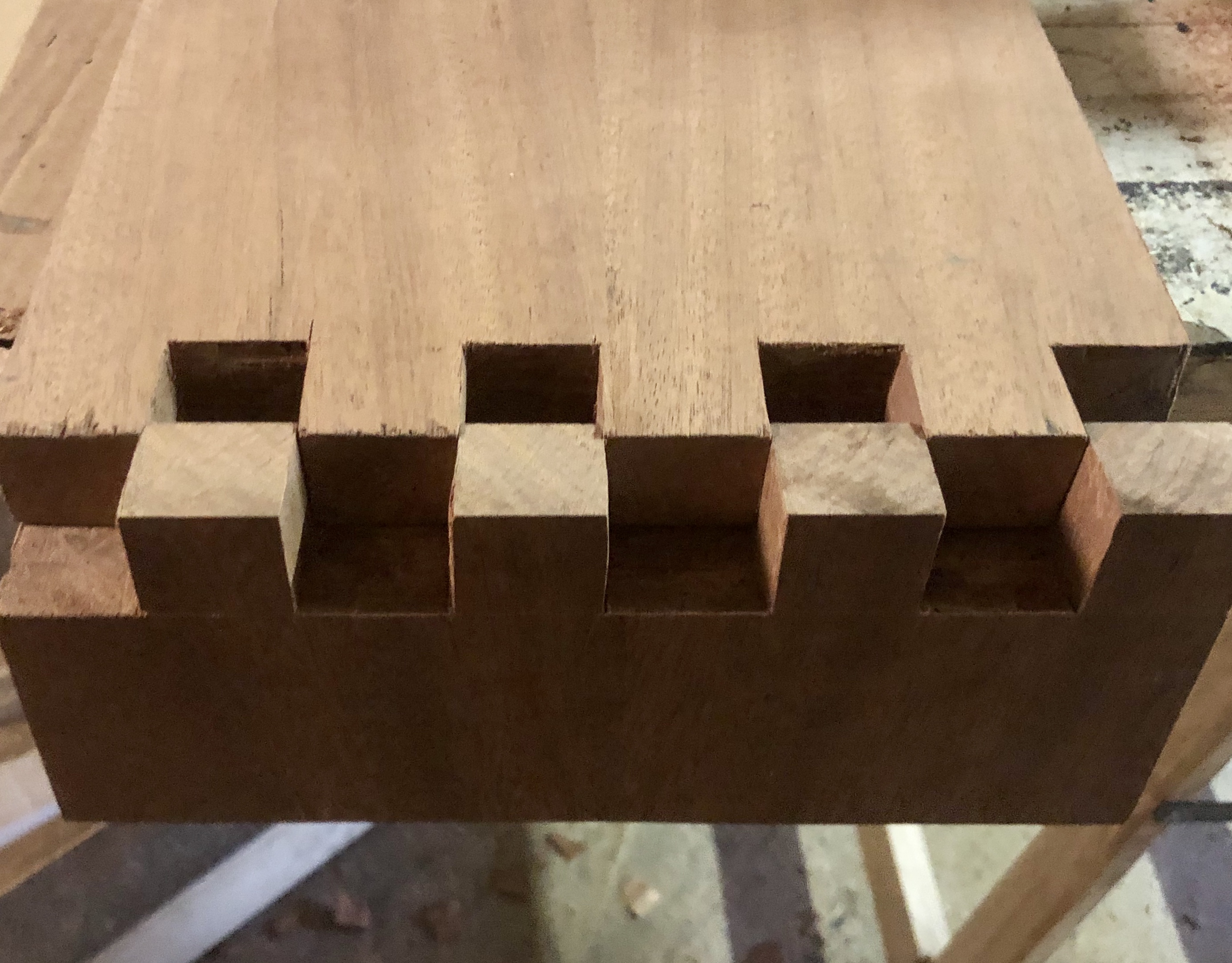 Pour le caisson, l’assemblage est à queues droites, entièrement réalisé avec des outils à main. Après application de la finition, le contraste de l’assemblage apporte une touche moderne et esthétique. Pour la seconde partie, un assemblage à coupe d’onglet à 45° pour une continuité des planches et un aspect design plus fluide.