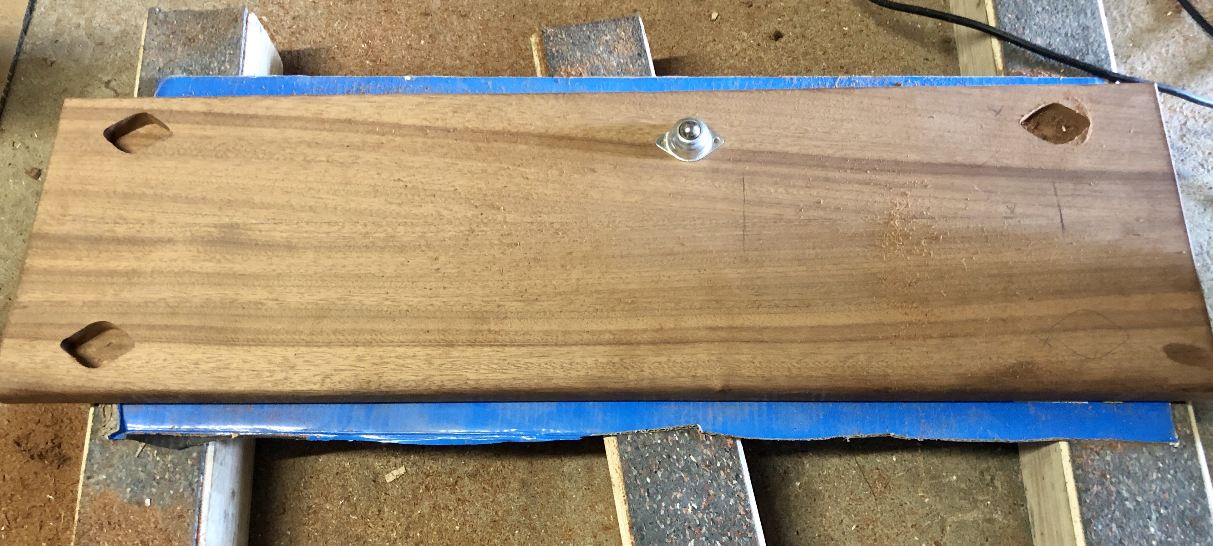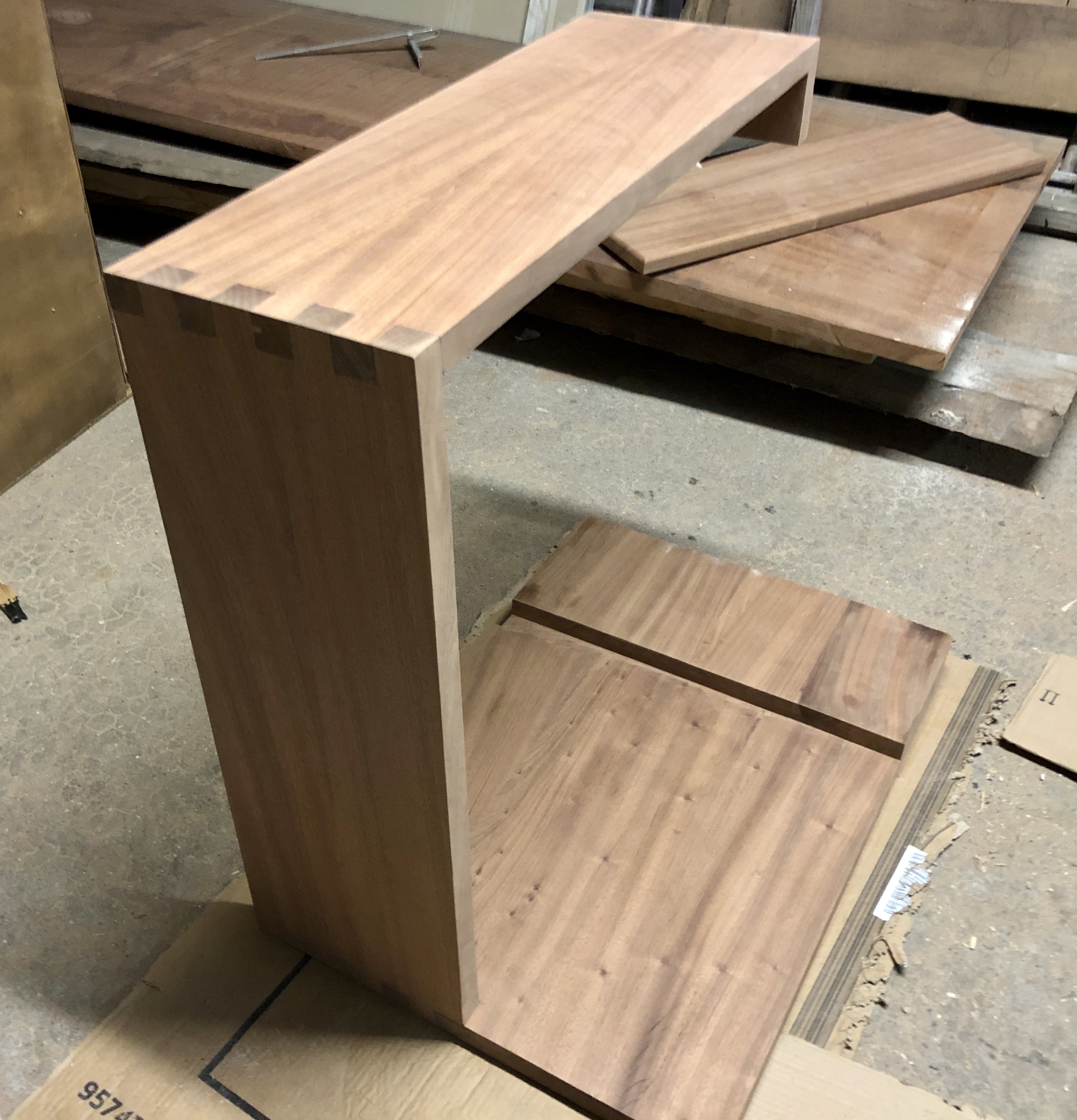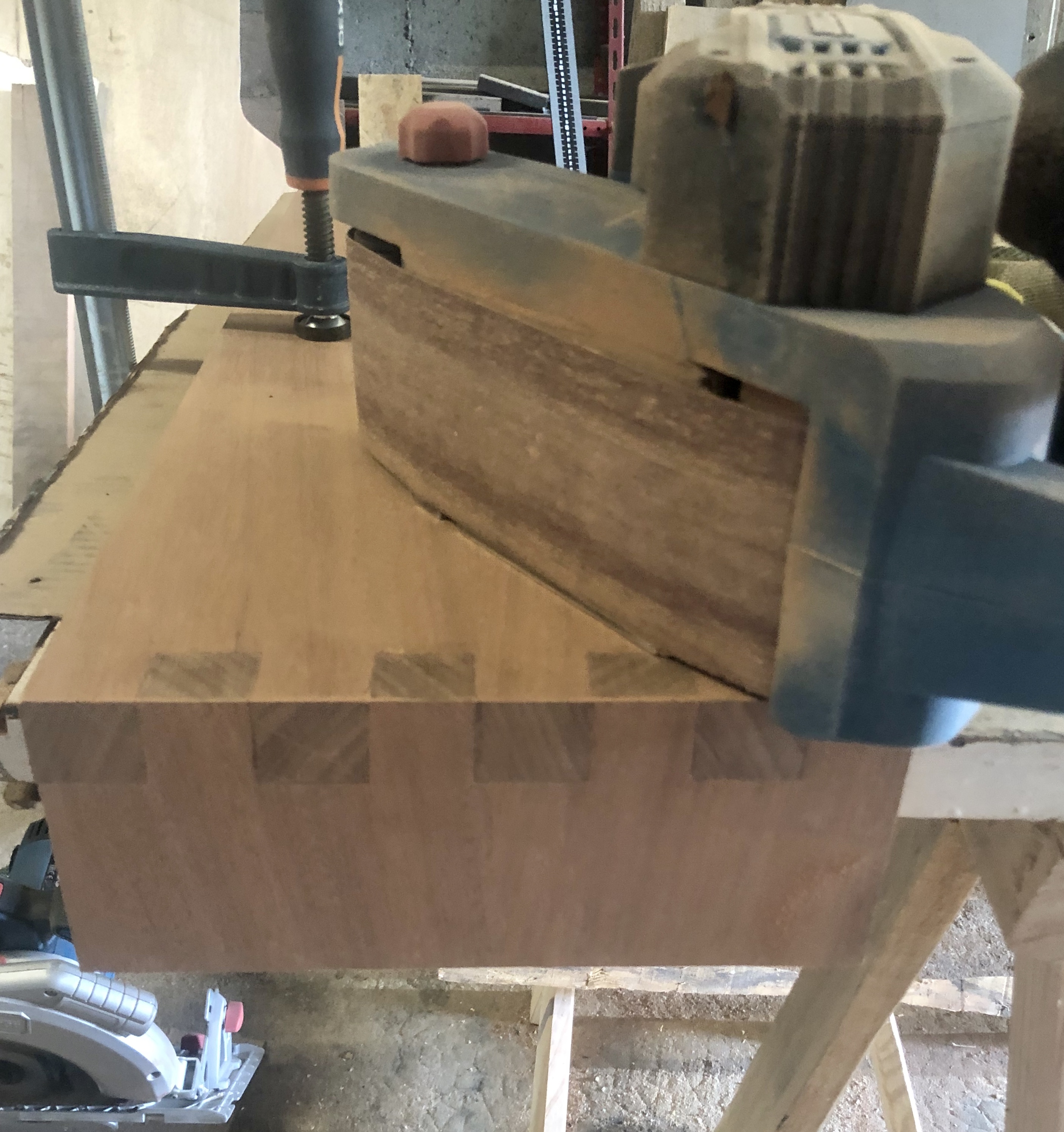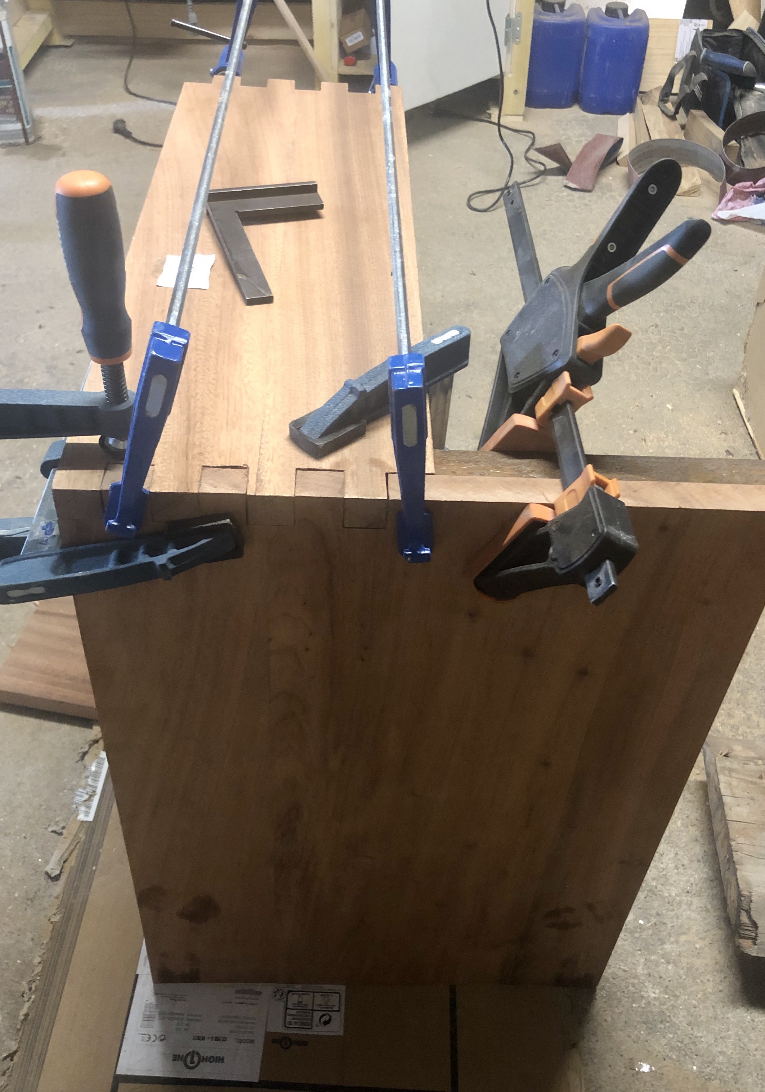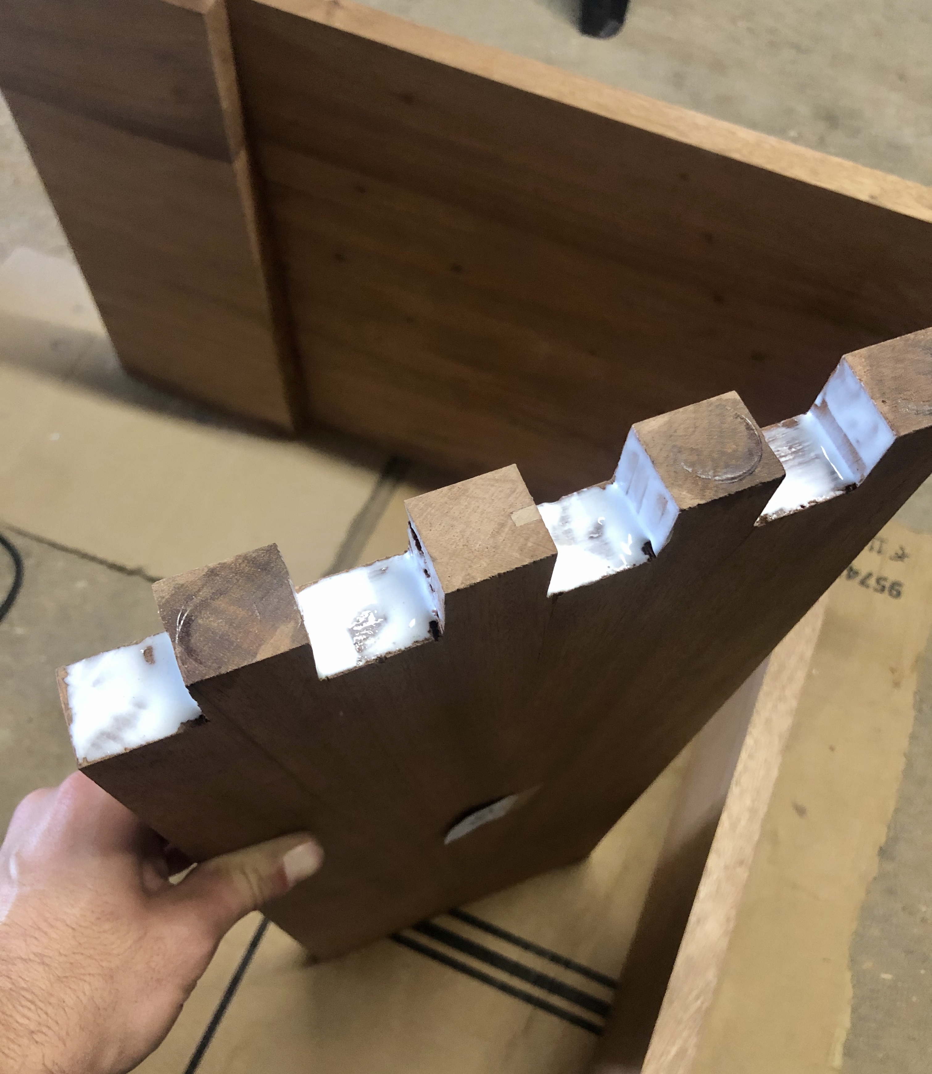 Pour le caisson, l’assemblage est à queues droites, entièrement réalisé avec des outils à main. Après application de la finition, le contraste de l’assemblage apporte une touche moderne et esthétique. Pour la seconde partie, un assemblage à coupe d’onglet à 45° pour une continuité des planches et un aspect design plus fluide.