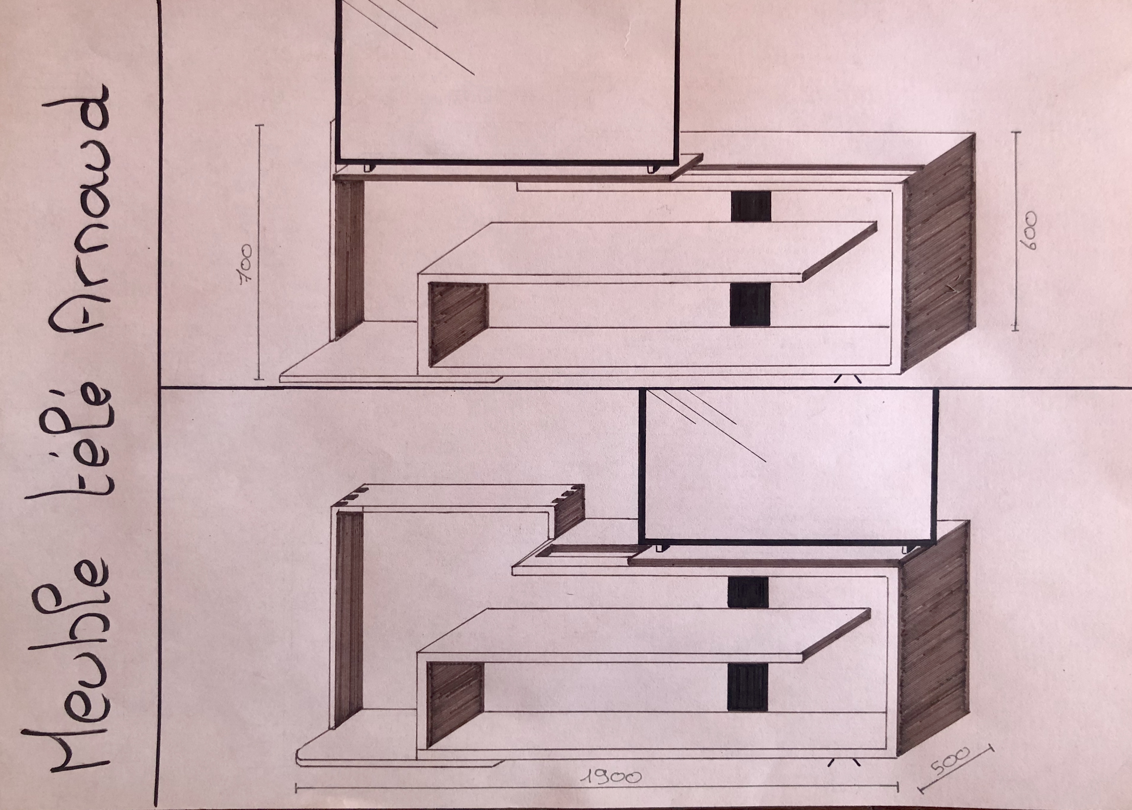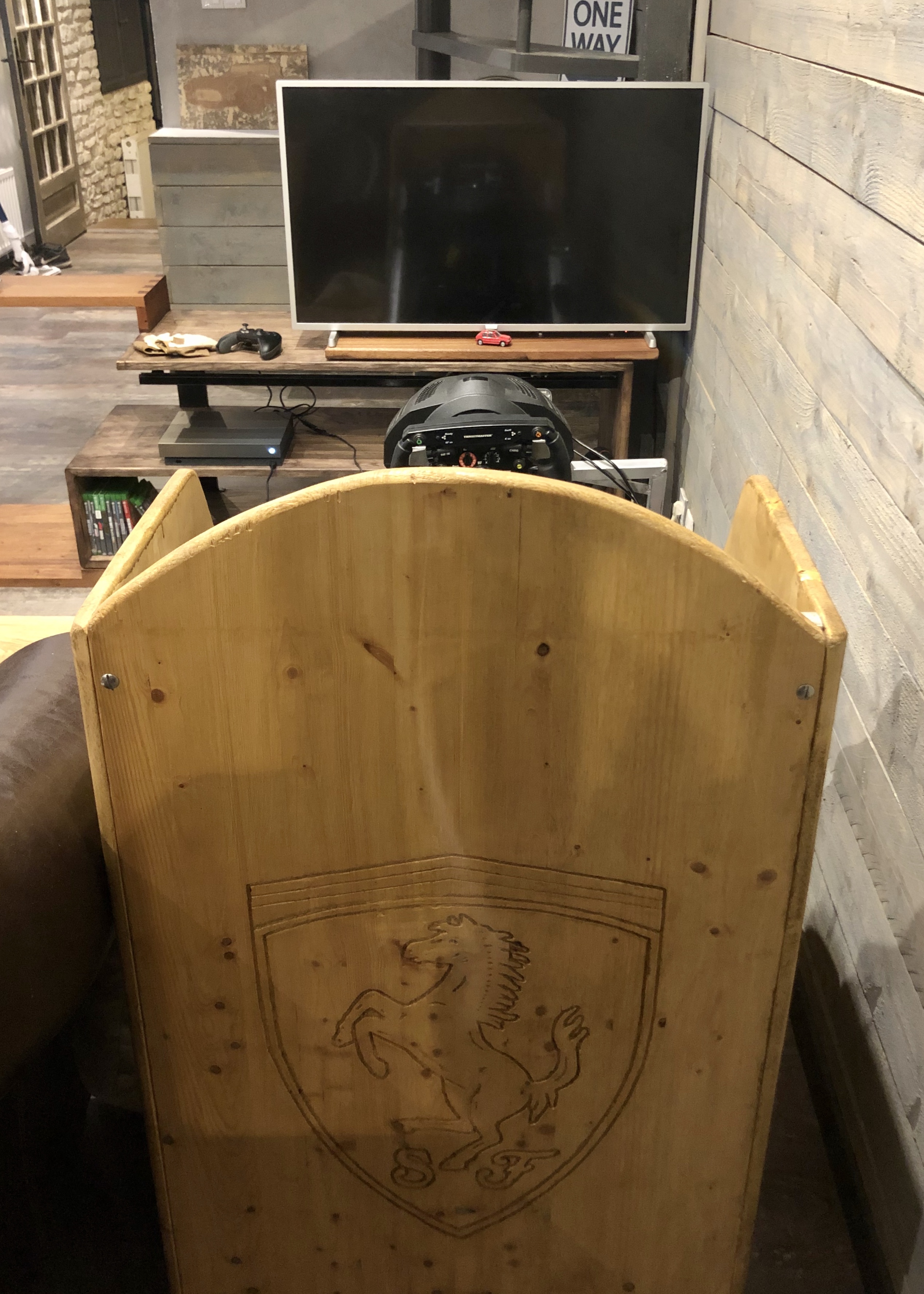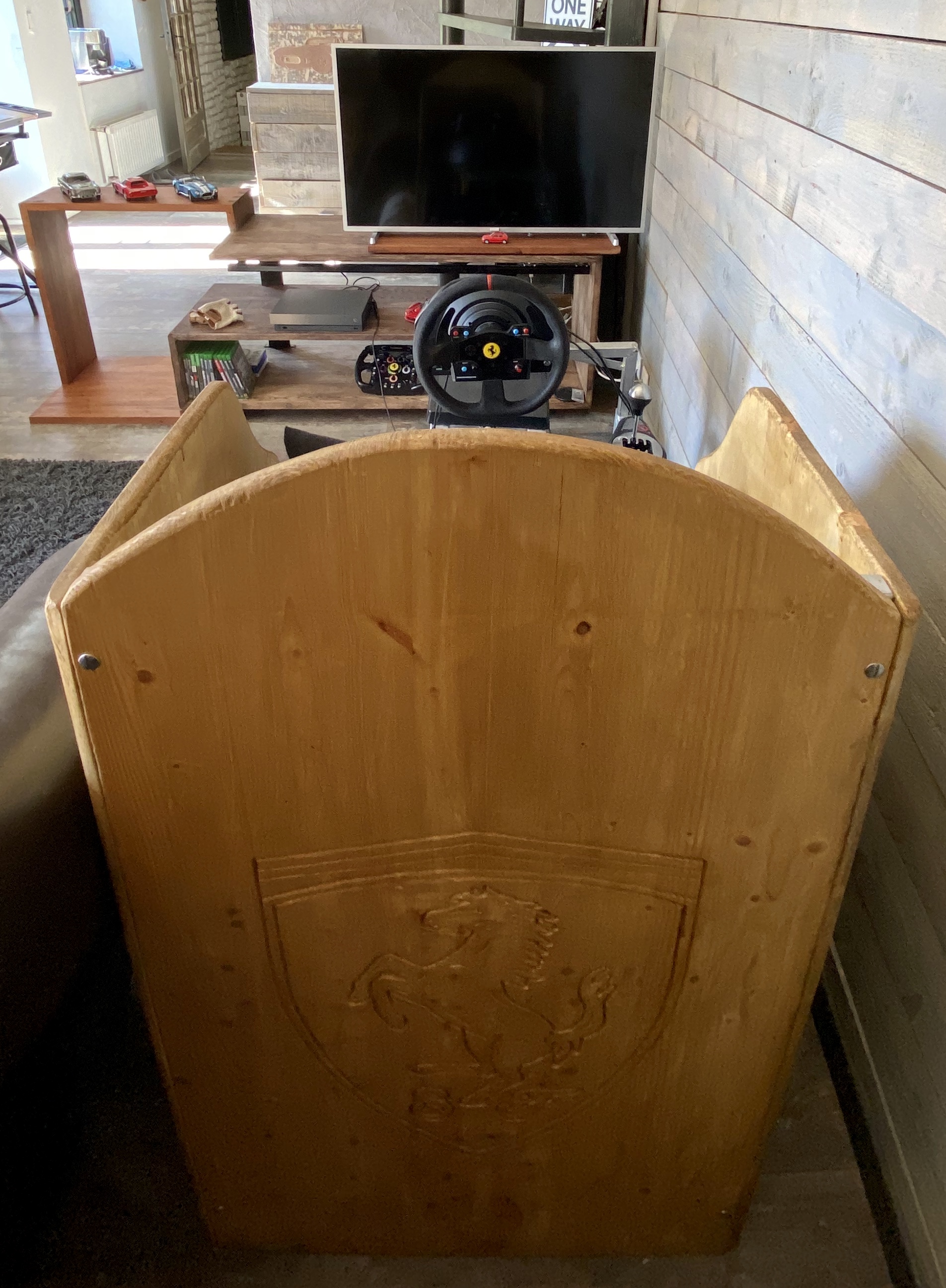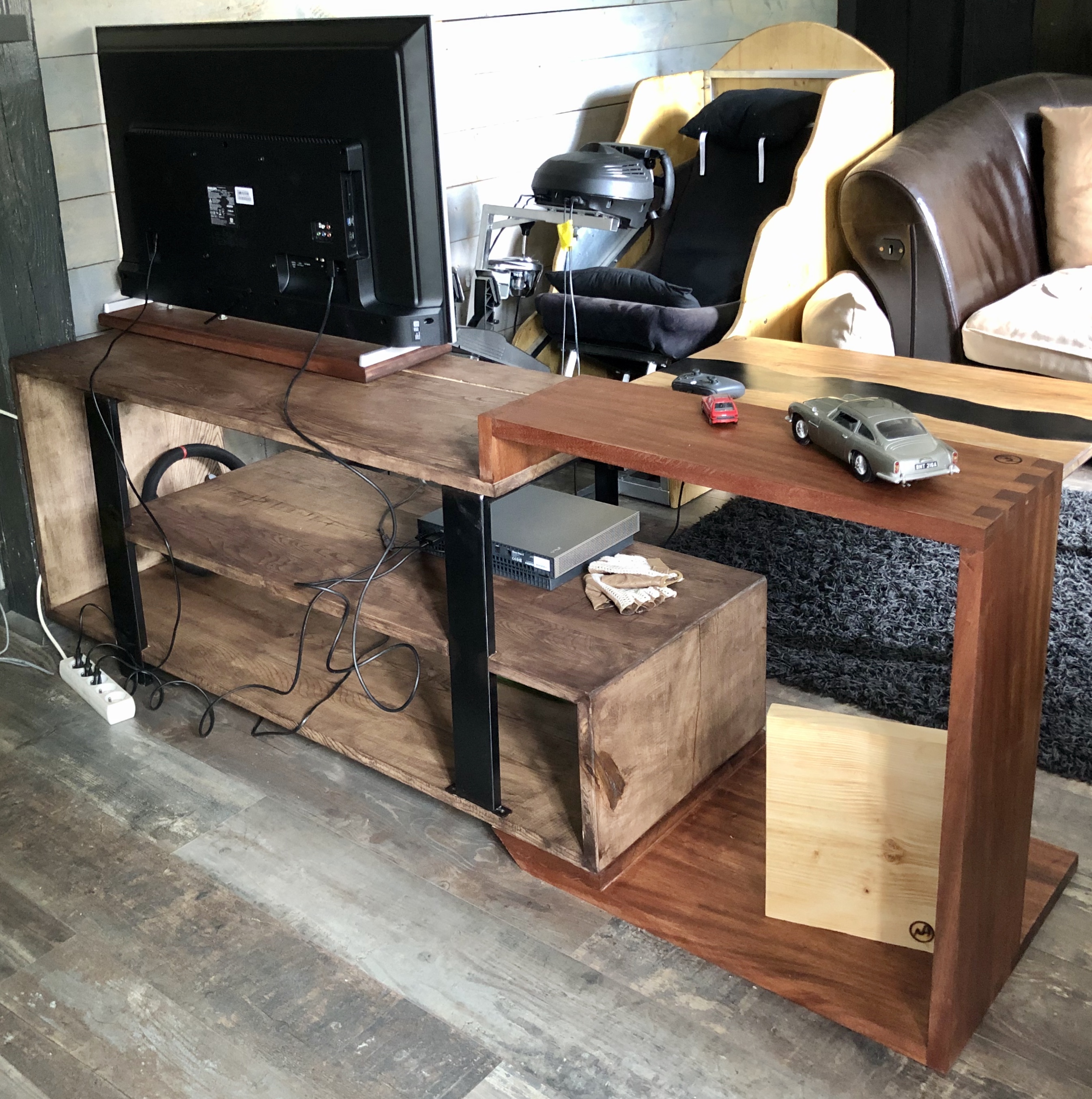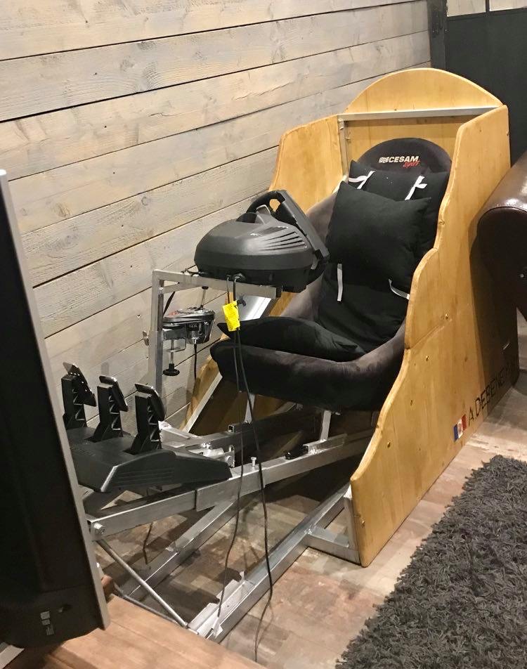 La tablette où repose la télévision est coulissante pour répondre aux besoins de départ. Ainsi, la télé se décale soit pour être en face du simulateur, soit pour être en face du canapé.