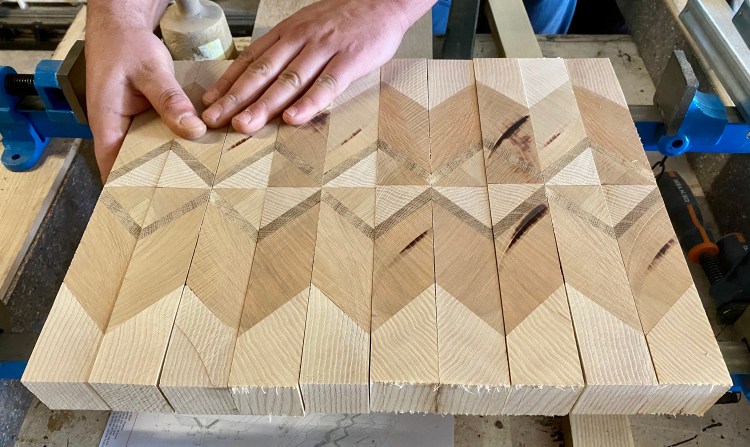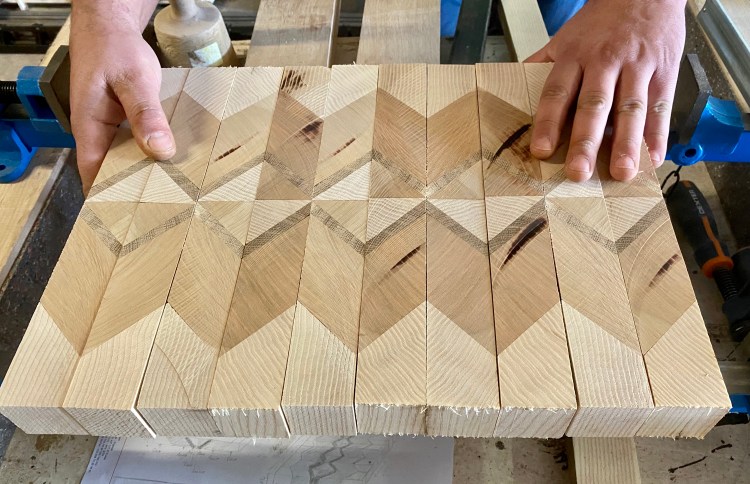 Les motifs sont obtenus après différentes découpes (coupe d’onglet à l’angle souhaité) et un collage précis pour créer des formes géométriques ou un effet de trompe l’oeil.