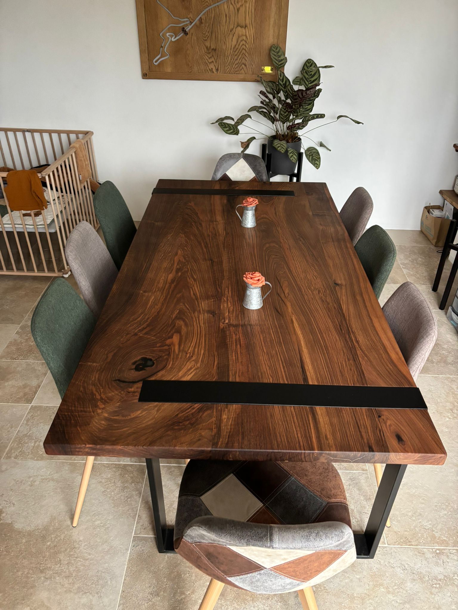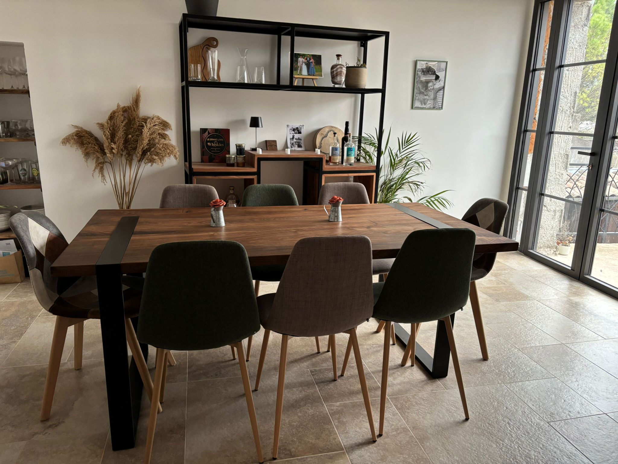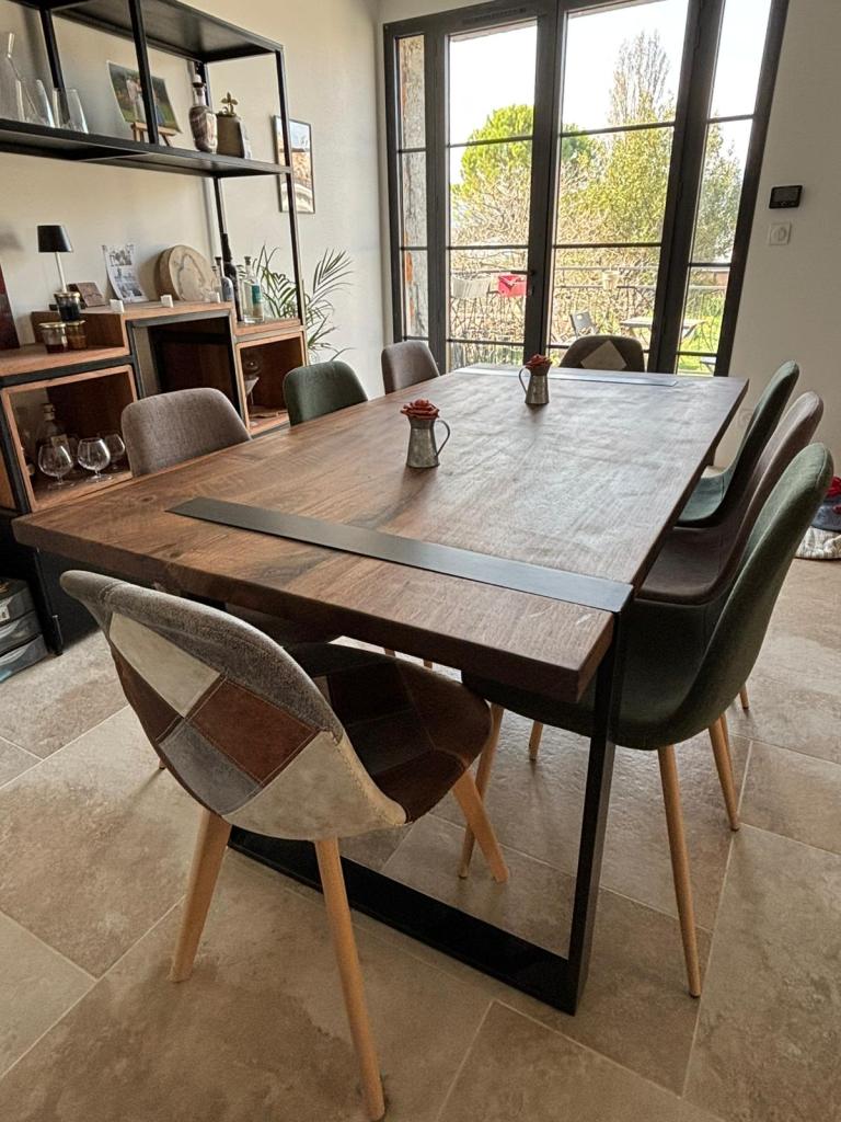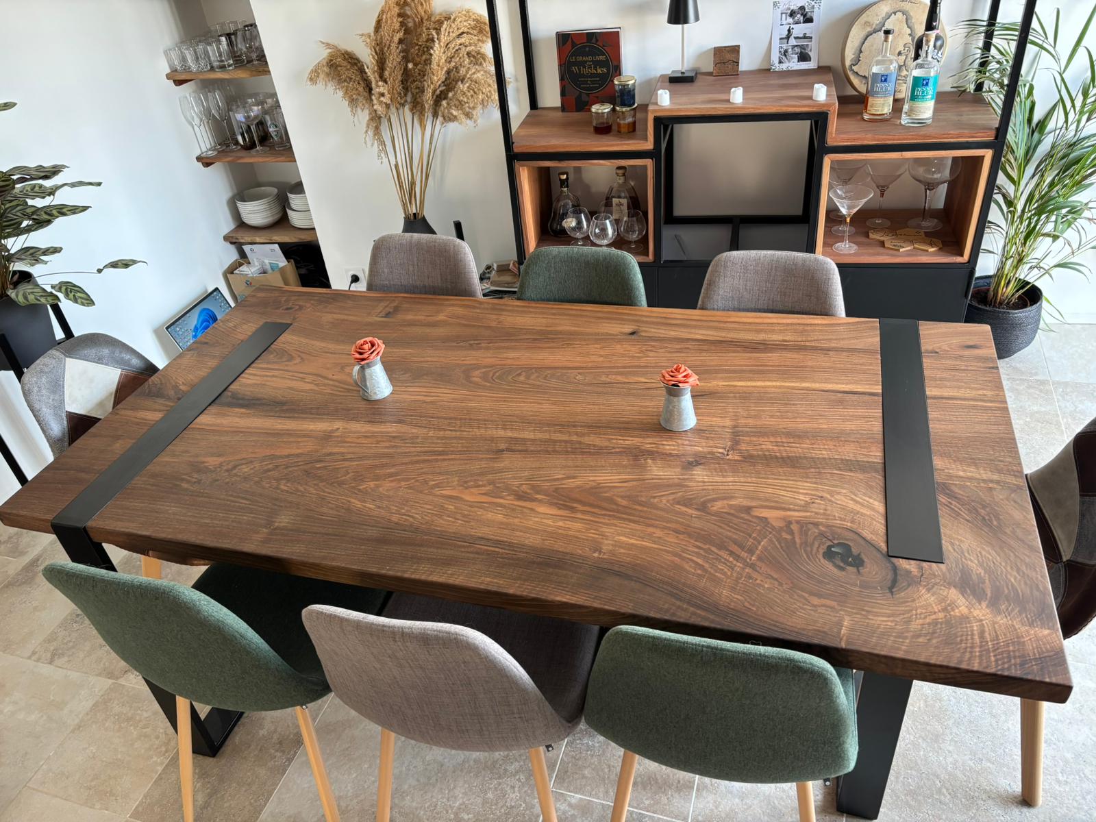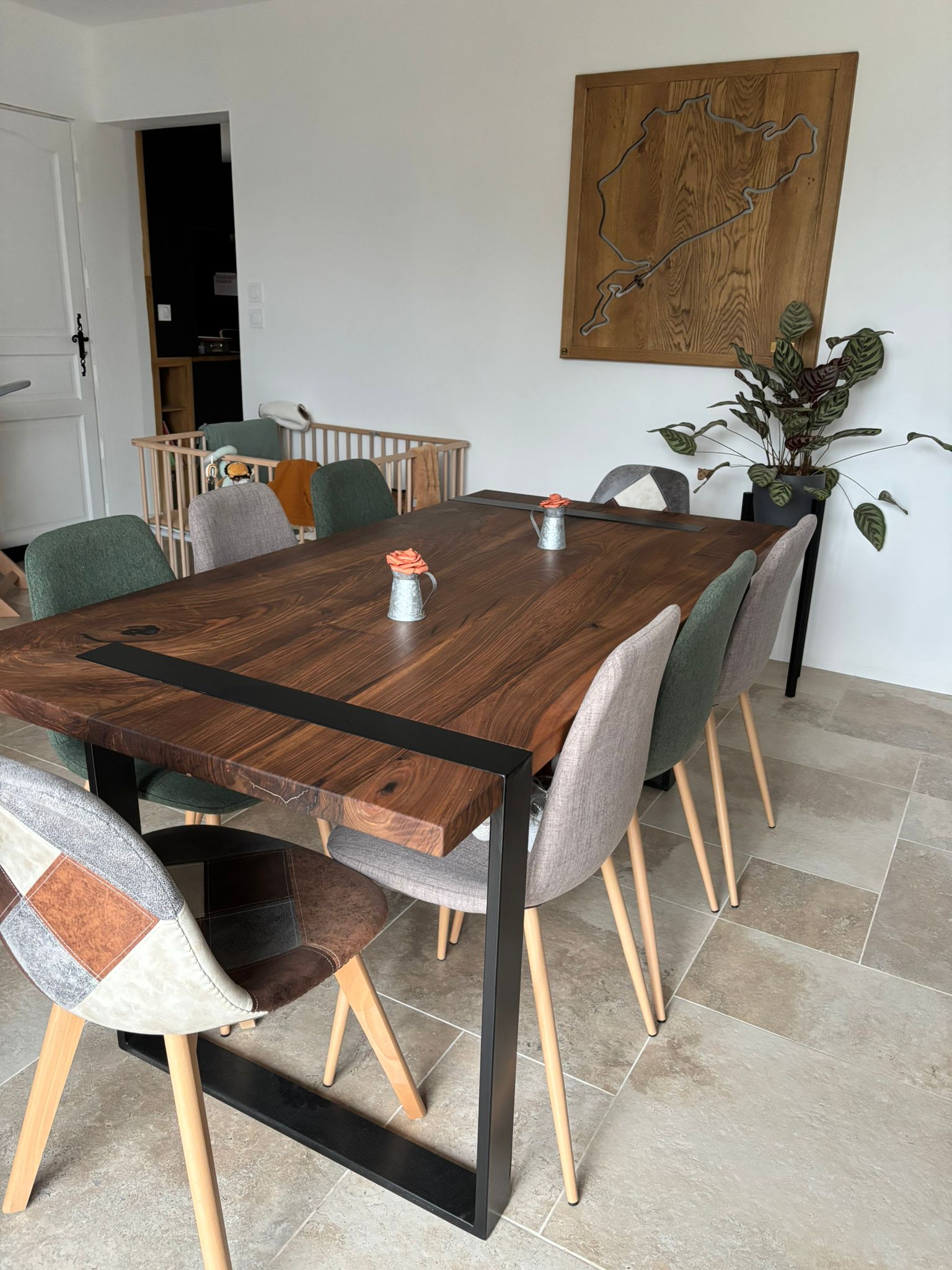 Piètements en acier noir qui s’incrustent parfaitement dans le bois de chaque côté de la table.