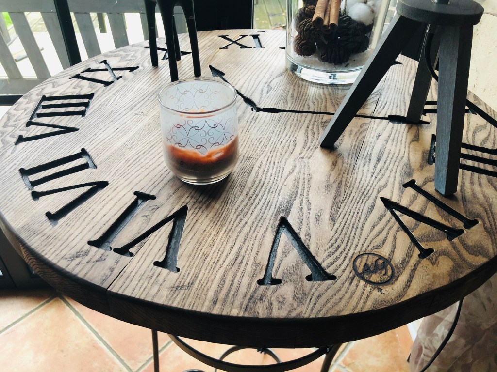Restauration d’une ancienne table de jardin. Seul le piètement a été préservé pour placer une tablette en chêne. L’originalité tient à la gravure Horloge qui donne une nouvelle vie et surtout une table unique.